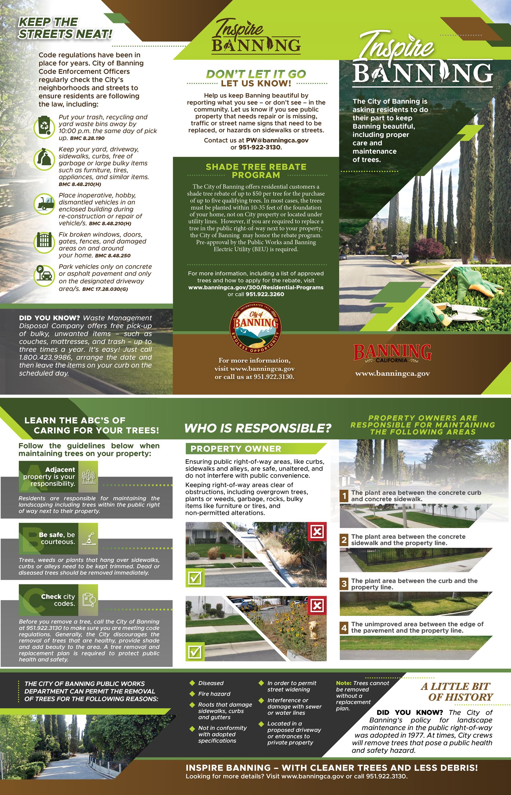 City Council Resolution 1977-15 (ROW Responsibility) establishes that it is the responsibility of property owners within the City of Banning to maintain all irrigation and landscaping within public rights of way that abut privately owned property. This includes features including turf, shrubs, trees, irrigation systems, and any other non-sidewalk features.